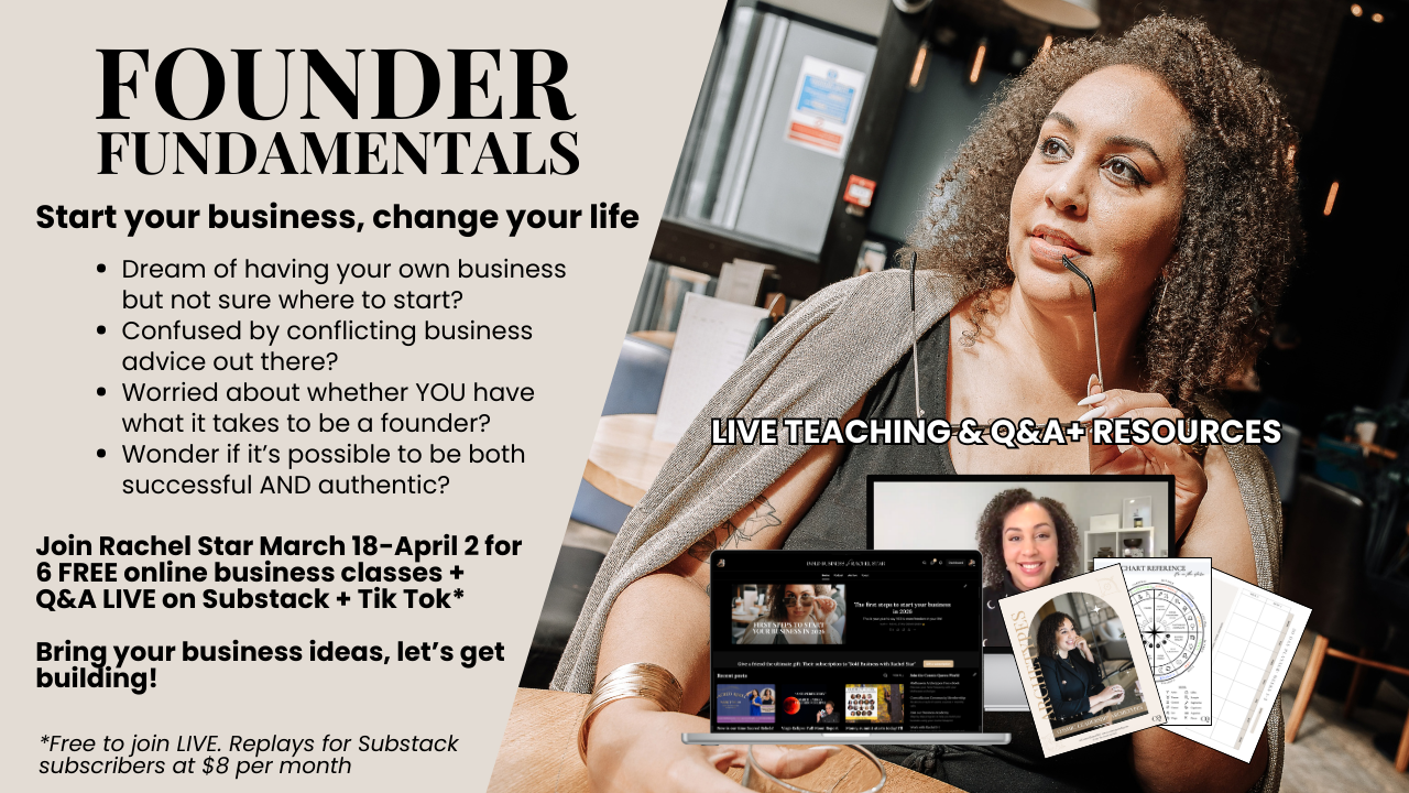 Start your business and change your life! Dream of having your own business but not sure where to start? In this FREE LIVE 3-week series (YES ACTUALLY FREE!), you'll ignite your creativity and passion as a Founder plus learn some valuable cosmic insights to use as you build the fundamental foundations of a business you love.